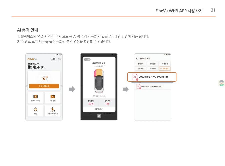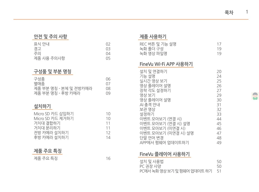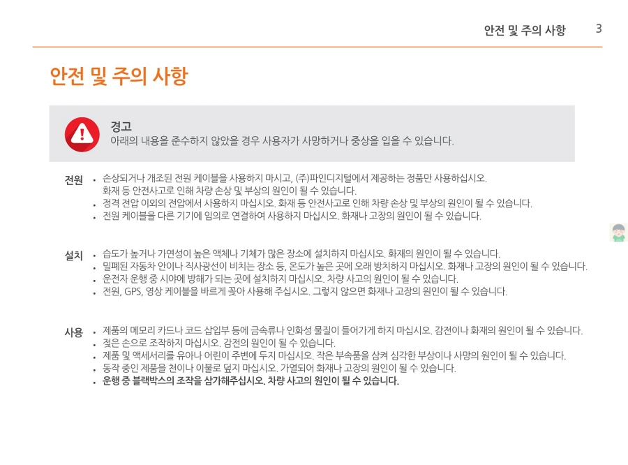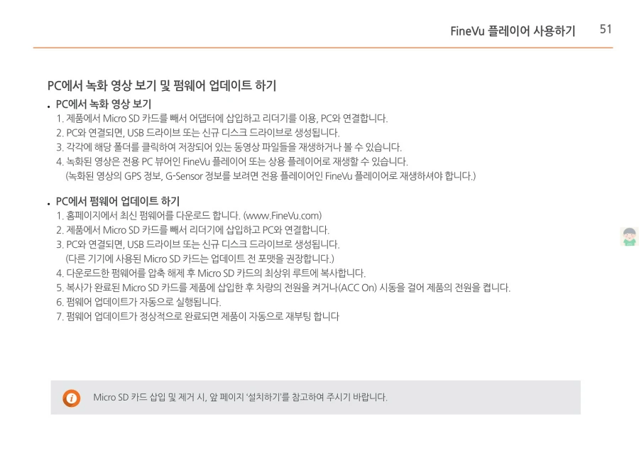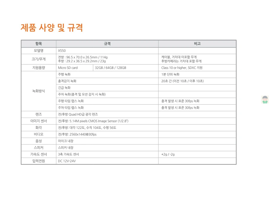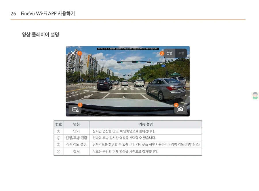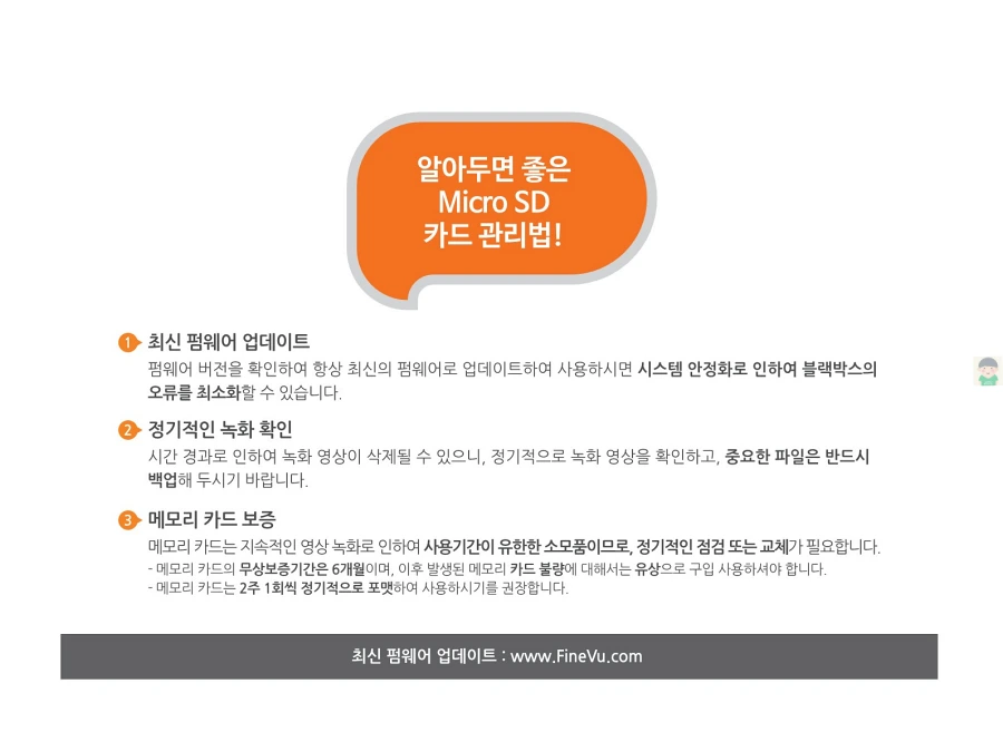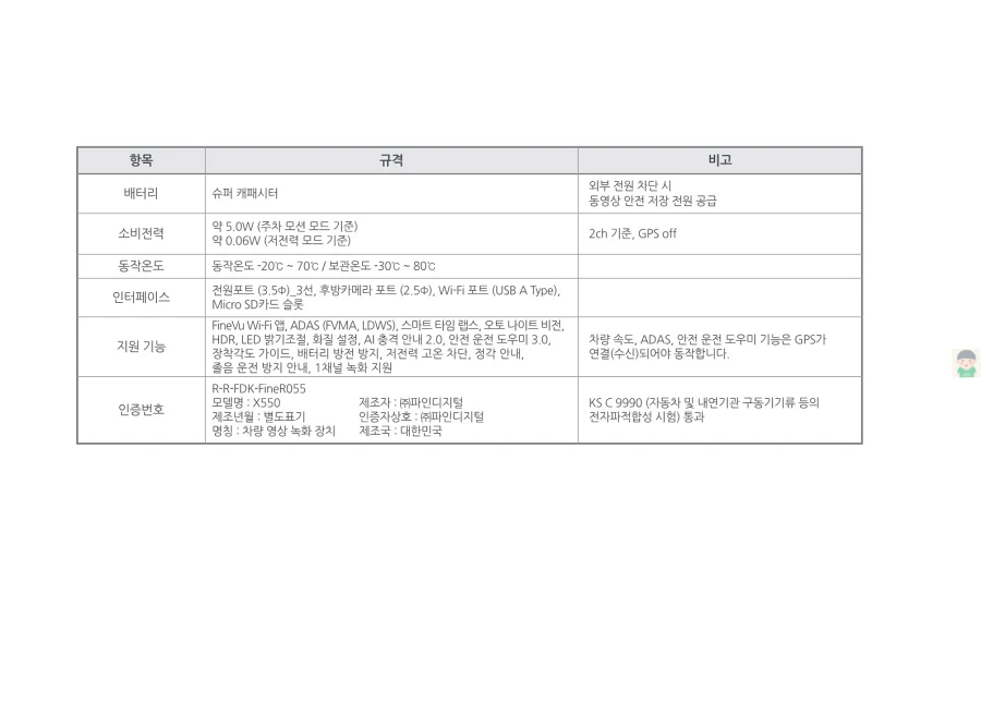 파인뷰 블랙박스 X550의 사용설명서입니다. 이미지로 정보를 바로 확인할 수 있습니다. 글자가 잘보이지 않을때에는 PC에서 이미지를 클릭하면 더 크게 보실 수 있고, 모바일에서는 손가락으로 확대하여 보실 수 있습니다.